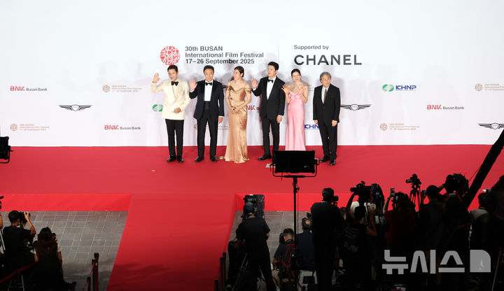 [부산=뉴시스] 하경민 기자 = 제30회 부산국제영화제 개막식이 열린 17일 부산 해운대구 영화의전당에서 개막작인 '어쩔수가없다' 박찬욱 감독과 배우들이 포토월 앞에서 인사를 하고 있다.26일까지 열흘간 열리는 이번 영화제는 7개 극장 31개 스크린에서 공식 초청작 64개국 241편과 커뮤니티비프 87편 등 총 328편의 작품을 상영한다. 2025.09.17. yulnetphoto@newsis.com