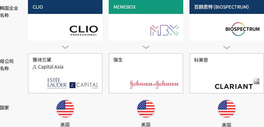 跨国企业-韩国企业收购案例 国家, 母公司名称, 韩国企业名称 国家 母公司名称 韩国企业名称 新加坡 ARDMORE MEDICAL GROUP Thuringen korea 美国 雅诗兰黛 haveandbe 荷兰 联合利华 科浡 法国 欧莱雅 Nanda(株) 瑞士 米格罗斯集团 美丽世界化妆品