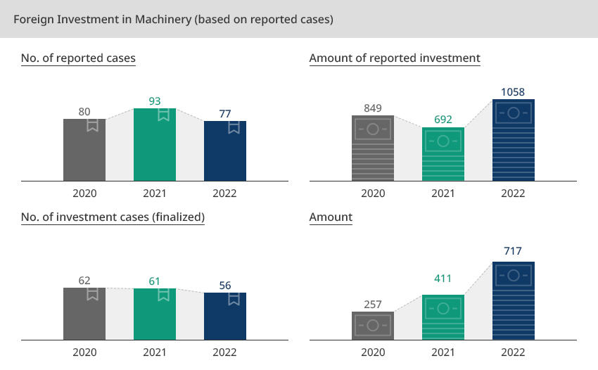 Foreign Investment in Machinery (based on reported cases) Type, Year Type 2020 2021 2022 1962~2022 Reported investment No. of cases 80 93 77 3,983 Amount 849 692 1,058 15,841 Finalized foreign investment No. of cases 62 61 56 1,786 Amount 257 411 717 9,982 ※ Source: Foreign Investment Statistics -
