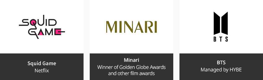 ※ Source: Ministry of Culture, Sports and Tourism (2023)Also noteworthy is that the Korean cultural content industry is a high-value-added industry with high input-output efficiency. Well-crafted key content and content IPs can help expand to various business models, eading to value creation through sales, exports and others. A good example of the industry's appeal to investors is the investment of foreign sovereign wealth funds in Kakao Entertainment, which has its own IPs and diverse business capabilities.Moreover, the Korean cultural content industry is known to have a significant economic and social ripple effect as it drives consumption and exports in related industries. The Korean cultural content industry is known to induce production worth KRW 36 trillion (as of 2019) in related upstream and downstream industrys.Studies show that when exports of cultural content increase by USD 100 million, exports of related consumer goods increase by USD 180 million while inducing production worth USD 510 million and create 2,982 jobs (as of 2022).Excellence and relatability of K-content recognized in the global marketK-content such as Squid Game, Minari, and BTS has been recognized for its excellence and relatability around the world by making global successes and winning awards at major global competitions. Their global success It is analyzed as a factor of global box office success because itThe global popularity of K-content stems from the fact that people around the world can relate to K-content as it deals with various social issues and topics that everyone can sympathize with, such as wealth inequality and the history of immigrants, while backed by detailed emotional lines of characters and cohesive storylines."K-Content’s Rise to Fame in the Global Market"- 오징어게임 - 넷플릭스