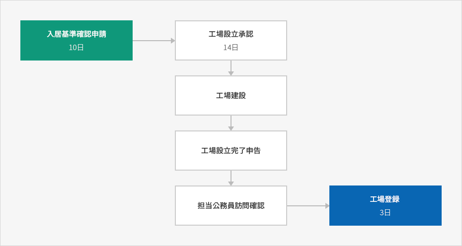 入居基準の確認申請当該土地に対する工場設立の可否を事前に確認する制度で、地方自治体に「立地基準確認申請」をした後、10日以内に結果が分かる。