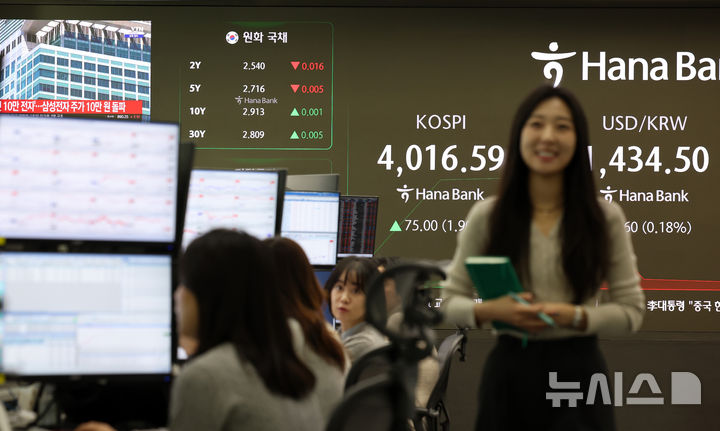 [서울=뉴시스] 이영환 기자 = 코스피가 전 거래일(3941.59)보다 58.20포인트(1.48%) 오른 3999.79에 개장한 27일 서울 중구 하나은행 딜링룸 전광판에 지수가 표시되고 있다. 코스닥 지수는 전 거래일(883.08)보다 7.15포인트(0.81%) 상승한 890.23, 서울 외환시장에서 원·달러 환율은 전 거래일 주간거래 종가(1437.1원)보다 0.4원 내린 1436.7원에 출발했다. 2025.10.27 20hwan@newsis.com