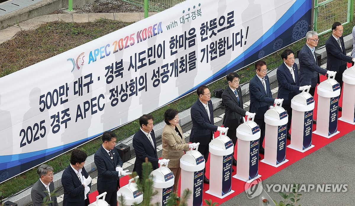 (대구=연합뉴스) 윤관식 기자 = 22일 대구 도시철도 3호선 칠곡차량기지에서 열린 '2025년 APEC 정상회의 성공 개최를 기원하는 대구·경북 APEC 열차 출발' 행사에 참석한 이철우 경북도지사와 김정기 대구시장 권한대행 등 관계자들이 APEC 홍보 열차 출발 퍼포먼스를 하고 있다. 2025.9.22 psik@yna.co.kr
