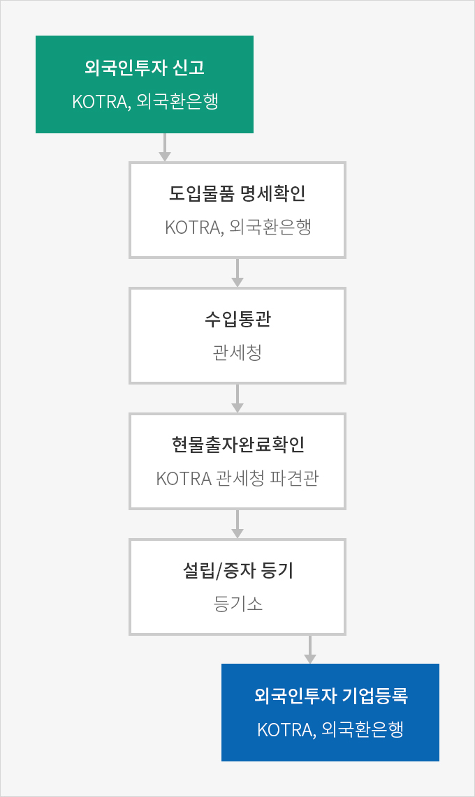 출자목적물로 납입되는 자본재는 KOTRA 관세청 파견관에게 현물출자 완료 확인을 받은 후에 회사설립 등기 및 외국인투자기업 등록을 진행한다.