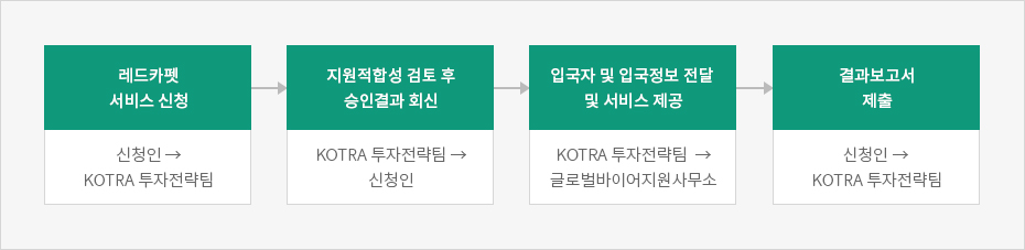 일정 요건을 갖춘 외국투자가에게 공항 도착 시점부터 출국 시점까지 필요한 제반 사항에 대해 원스톱서비스를 제공한다. 투자가의 중요도에 따라 기본서비스 및 프리미엄 서비스로 구분되며, 기본서비스에는 입국 및 차량지원 서비스가, 프리미엄 서비스에는 전 일정 차량제공, 투자 상담주선, PM 수행지원 서비스가 포함된다. 게이트 픽업 및 CIQ* 수속지원은 KOTRA 글로벌바이어지원사무소가 소재하는 인천공항에서만 지원 가능하며, 출국 시 수속 지원은 없다.