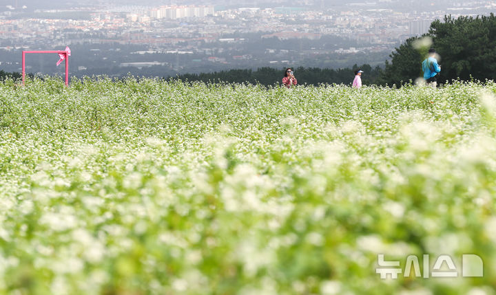 [제주=뉴시스] 우장호 기자 = 절기상 추분인 23일 오전 제주시 오라동 메밀꽃밭을 찾은 관광객들이 막 피기 시작한 메밀꽃을 감상하며 선선해진 가을 날씨를 만끽하고 있다. 2025.09.23. woo1223@newsis.com