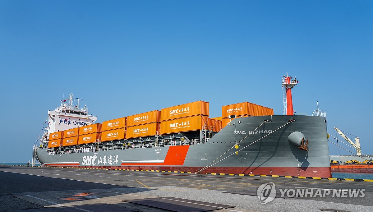 (제주=연합뉴스) 제주∼중국 칭다오 해상항로가 개통한 16일 칭다오항 국제크루즈부두에서 컨테이너선인 'SMC 르자오'호가 첫 제주 취항을 기다리고 있다. 2025.10.16 [제주도 제공.재판매 및 DB 금지] koss@yna.co.kr